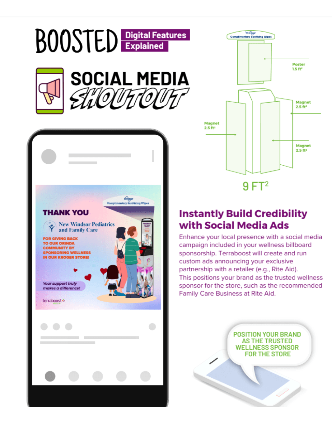 TERRABOOST'S wellness kiosks prominently feature the retailer’s logo giving your brand a unique opportunity to align with nationally recognized names and gain a valuable implied endorsement from businesses communities have trusted for decades.